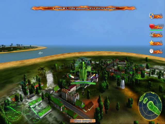 Итак, обучающая миссия успешно завершена, пора приступать к военной операции. Укажите степень сложности игры: "турист", "вояка" или "хардкорщик". А может быть, поиграем "на выживание"? Тогда выберите время суток, погоду, сопровождение — легкое, стандартное или армаду. И в какой кампании вы хотели бы принять участие — над Европой, островами или Афганистаном? Если выбор сделан, пора начинать полет! Следуйте за стрелками — они приведут вас к цели. Внизу экрана есть карта: она поможет быстро сориентироваться, где именно вы находитесь. А справа — точная информация о боеприпасах, состоянии вертолета и сбитых вами целях.