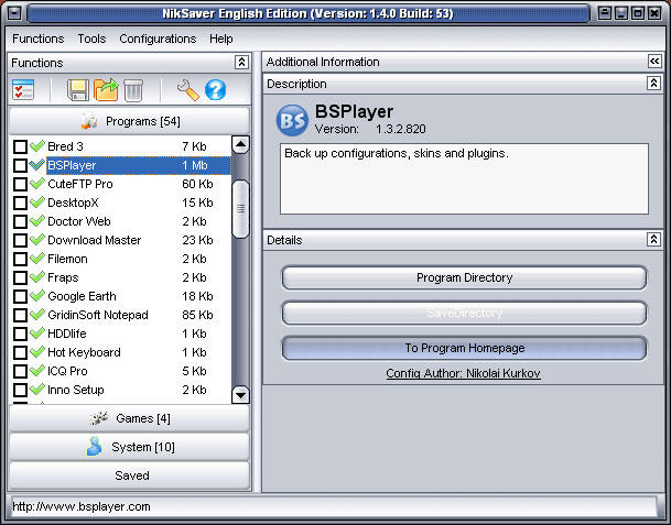 Что вы первым делом делаете после установки операционки и софта? Настраиваете его. А почему бы просто не сохранить все свои настройки один раз и потом ими пользоваться? Именно этим и занимается программа. С ней вы забудете, что такое настройка программ, просто один раз сохраните все ваши настройки и запиши их, например, на диск или флеш-карту. Наша программа решает три важнейшие проблемы: - Настройка компьютера после переустановки ОС или сбоя. - Перенос вашей рабочей среды на другой компьютер. - Установка одинаковых настроек на несколько комьютеров. Вам больше не нужно часами настраивать все программы, теперь это можно сделать парой щелчков мыши. Вы сами удивитесь той легкости, с какой программа сохраняет и переносит настройки. И главное - программа работает на любом компьютере с любой конфигурацией! Неважно, в какое место вы устанавливали программы, мы позаботились об этом: программа автоматически распознает, где что расположено и уже с учетом этого определит, где какая программа хранит настройки. Затем она бережно скопирует их в указанную вами папку, после чего можно смело сохранять эту папку на флешку или в другое безопасное место и не беспокоиться за сохранность своих персональных данных, настроек и контактов. Помните: легче потратить минуту на сохранение данных, чем потом тратить часы, дни и месяцы на восстановление данных. Полное описание »