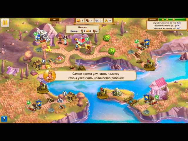 Когда ресурсы пополнятся, можно будет посетить рынок и сделать запасы необходимого товара, а также закупить оборудование. К примеру, новенькая кирка позволит разбивать валуны быстрее, а новые сандалии для рабочих повысят производительность труда. Можно будет попытать счастье и попробовать угадать сундук с призом.