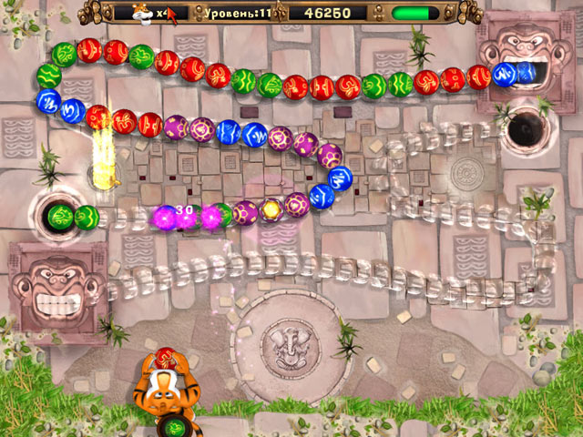 Временами среди извивов многоцветной цепочки появляется статуя золотой обезьяны. Это призрак тех сокровищ, которые ждут вас впереди. Скорее стреляйте в нее шарами, ведь через некоторое время она исчезнет! Собирайте золотые изваяния, чтобы заработать дополнительные очки.