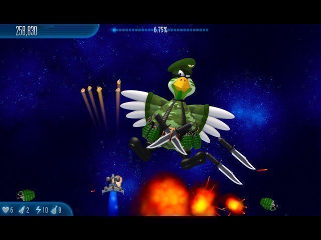 В вашем распоряжении будут 13 видов оружия, каждое из которых можно улучшить в 12 раз, и это значит, что вам будет чем ответить куриному войску! Отстреливайте врагов, отбивайтесь от космических чудовищ, ловите выпадающие из них припасы для наращивания мощи своего арсенала! Чтобы сменить тип оружия вам нужно будет просто поймать подарочную коробочку, но будьте осторожны – каждое вооружение имеет свои особенности, и не всегда они могут прийтись ко двору!