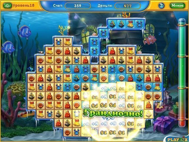 Прежде всего нужно заработать денег, чтобы приобрести все необходимое для дизайна вашего аквариума. Для этого составляйте комбинации из фишек, по три в ряд, меняя местами соседние. А если получится собрать ряд из пяти фишек, то вам причитается бонус — бомба, взрывающая все вокруг себя в радиусе двух клеток. Уровень считается завершенным, когда вы уберете с игрового поля все золотые клетки. За каждый успешно пройденный уровень вы получаете деньги, которые смело можно тратить в магазине подводных чудес!