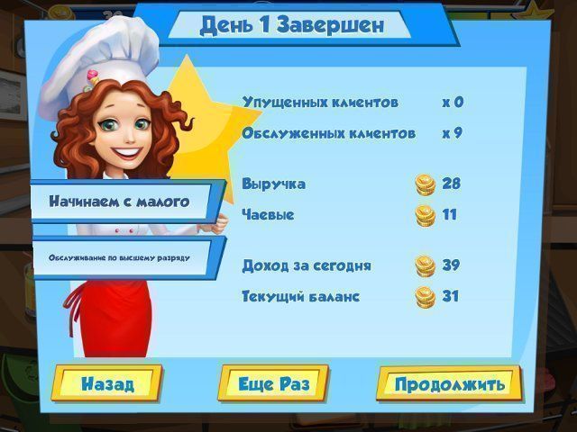 Устройтесь для начала в кафе. Знали ли вы, что офисные сотрудники любят такие заведения за скорость и простоту блюд? Не разочаруйте их! Каждый день вы будете получать новое задание. Здесь вы научитесь готовить лучшие в городе бутерброды с курицей, черный кофе и омлет. Конечно, не сразу все будет получаться: мясо может пережариться, омлет подгореть, а кофе вовсе остыть. Чтобы избежать этого, подготовьтесь к новому дню заранее. В противном случае вы запросто потеряете клиента. И запомните, что довольный клиент — щедрый клиент. А вам еще предстоит побороться за «поварешки» и золотые монеты. Их вы сможете обменять на новую технику, которая существенно облегчит вам работу. К концу дня ваши успехи будут вознаграждены звездой и звонкими монетами в кассе. А лучшей похвалой станут улыбки посетителей.