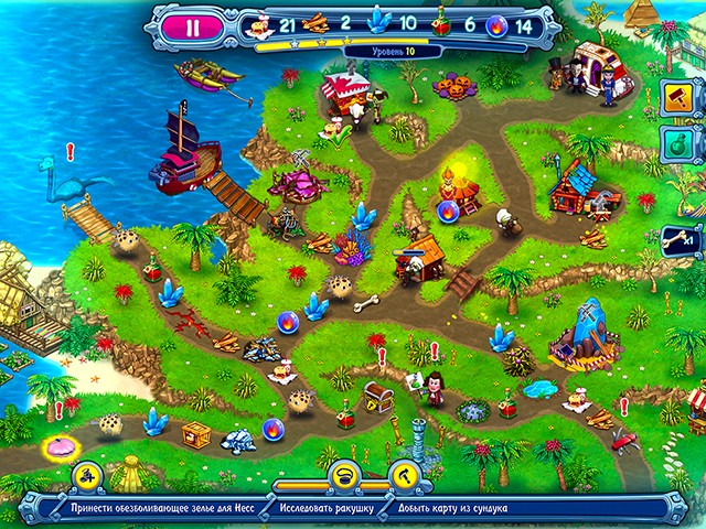 В этой части игры, как и в предыдущих, тоже есть полезные бонусы и улучшения. В процессе прохождения вы сможете находить волшебные амулеты в таинственных ракушках. Они разные: дают ресурсы, увеличивают скорость персонажей, дают повышенную производительность зданиям и всячески помогают проходить уровни. Кроме этого, Дракула может прокачивать магию и навык создания нужных вещей. Зелья, эликсиры, волшебный посох, огнемет и даже сеть, чтобы нейтрализовать огромных и опасных медуз – все это можно сделать самому при наличии нужных ингредиентов, которые находятся на карте уровня или покупаются у торговцев.