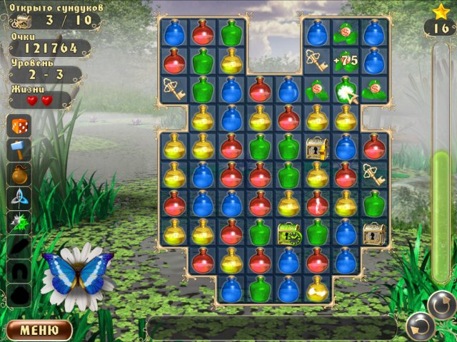 На игровом поле в хаотичном порядке расположены цветные бутылочки. Среди них находятся заветные сундучки и ключики. Ваша задача поместить их на соседние клетки, а затем совместить. Для этого нужно передвигать бутылочки таким образом, чтобы после каждого хода получилась непрерывная линия из трех или более фишек одного цвета.