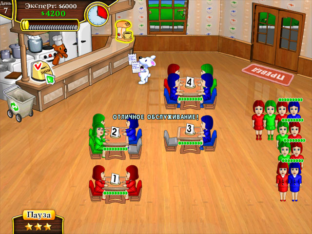Посетители попадаются разные — среди них и степенные бизнесмены, и нетерпеливые подростки. Каждый из них может ожидать своей очереди только небольшой промежуток времени. А если испытывать их терпение — то они обидятся и уйдут обедать к конкурентам. Впрочем, Снежок может повысить настроение посетителям, если споет им веселую песенку.