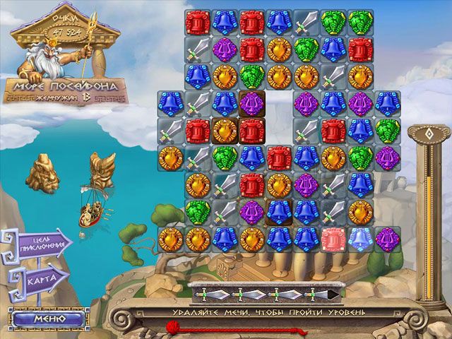 Разгадывайте головоломки "три в ряд", собирайте комбинации из трех и более одинаковых элементов, чтобы провести сверху вниз по игровому полю чудесные жемчужины из нити Ариадны. Учитесь правильно использовать бонусы. Изумруд удаляет горизонтальный ряд фишек, сапфир — вертикальный, а еще на поле могут появиться оникс, кварц и топаз. Разобраться в свойствах этих драгоценных камней несложно, и все они помогут вам при прохождении уровней.